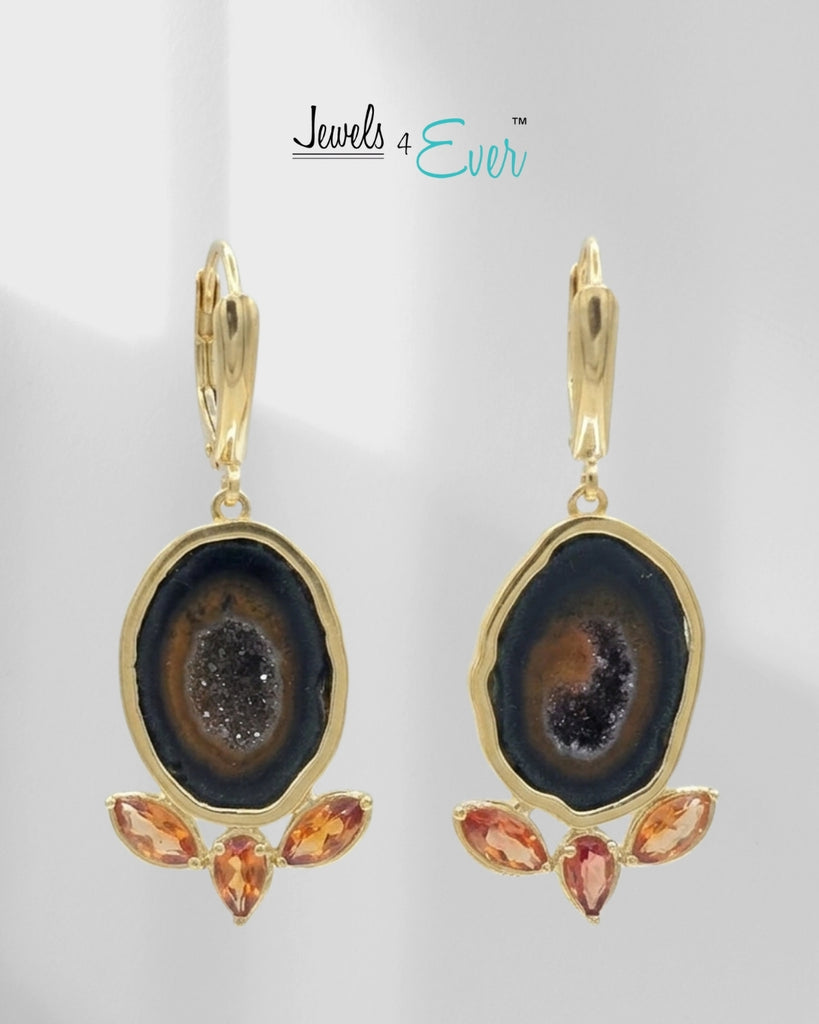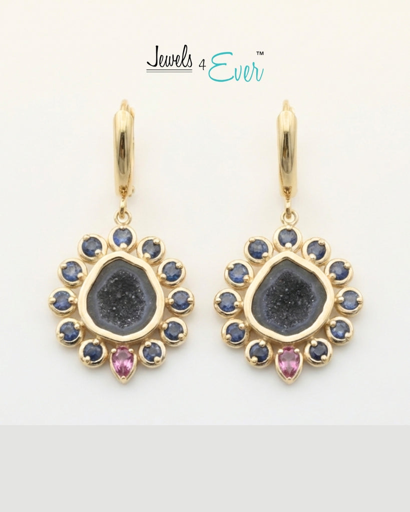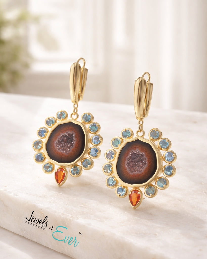 Handcrafted in 14kt gold. Made in Canada and designed by award-winning designer Anita Agrawal. Each piece is one of a kind and unique. These earrings feature a raw, sparkling geode at the center, encircled by mesmerizing stones.