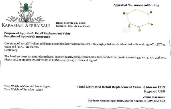 • Five bezel set heart cut natural amethyst, smokey quartz, pyrope garnet, blue topaz and citrine quartz
