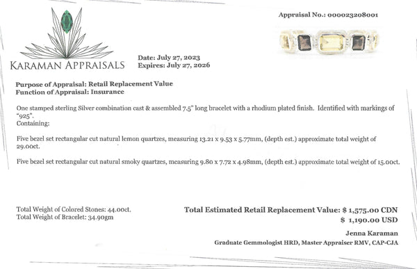 Sterling Silver Lemon and Smokey Quartz 44cts Bracelet