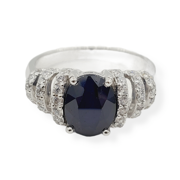 • (b): One prong set oval cut 8.98x7.15mm natural blue sapphire 2.00ct with 48 prong set round cut cubic zirconia 0.48ct, Ring Weight: 3.93 grams